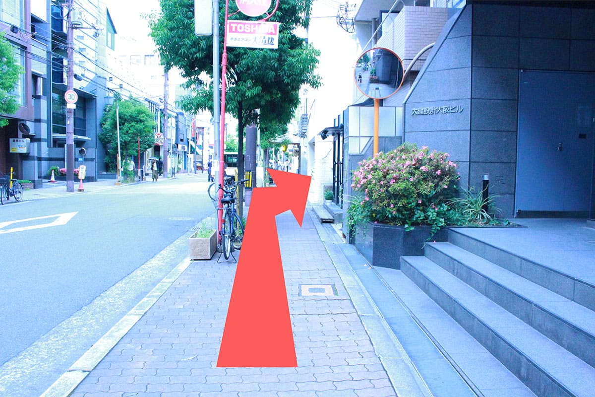 四ツ橋筋の信号を渡り、右手に赤い看板のインプラントセンター。まっすぐ