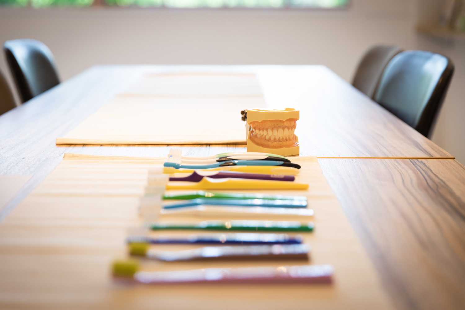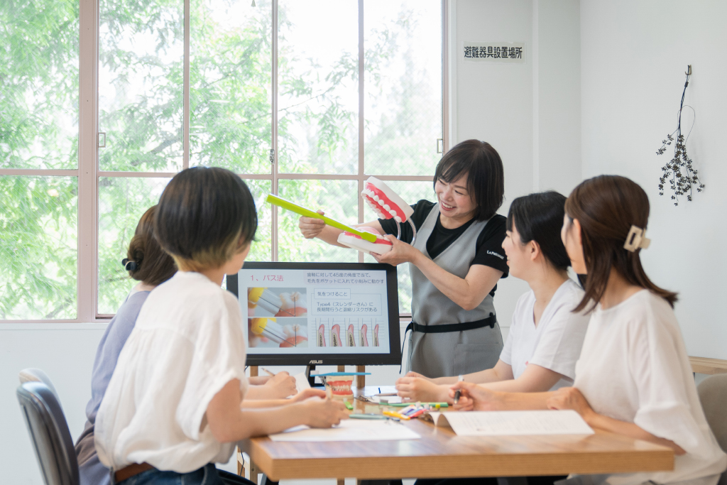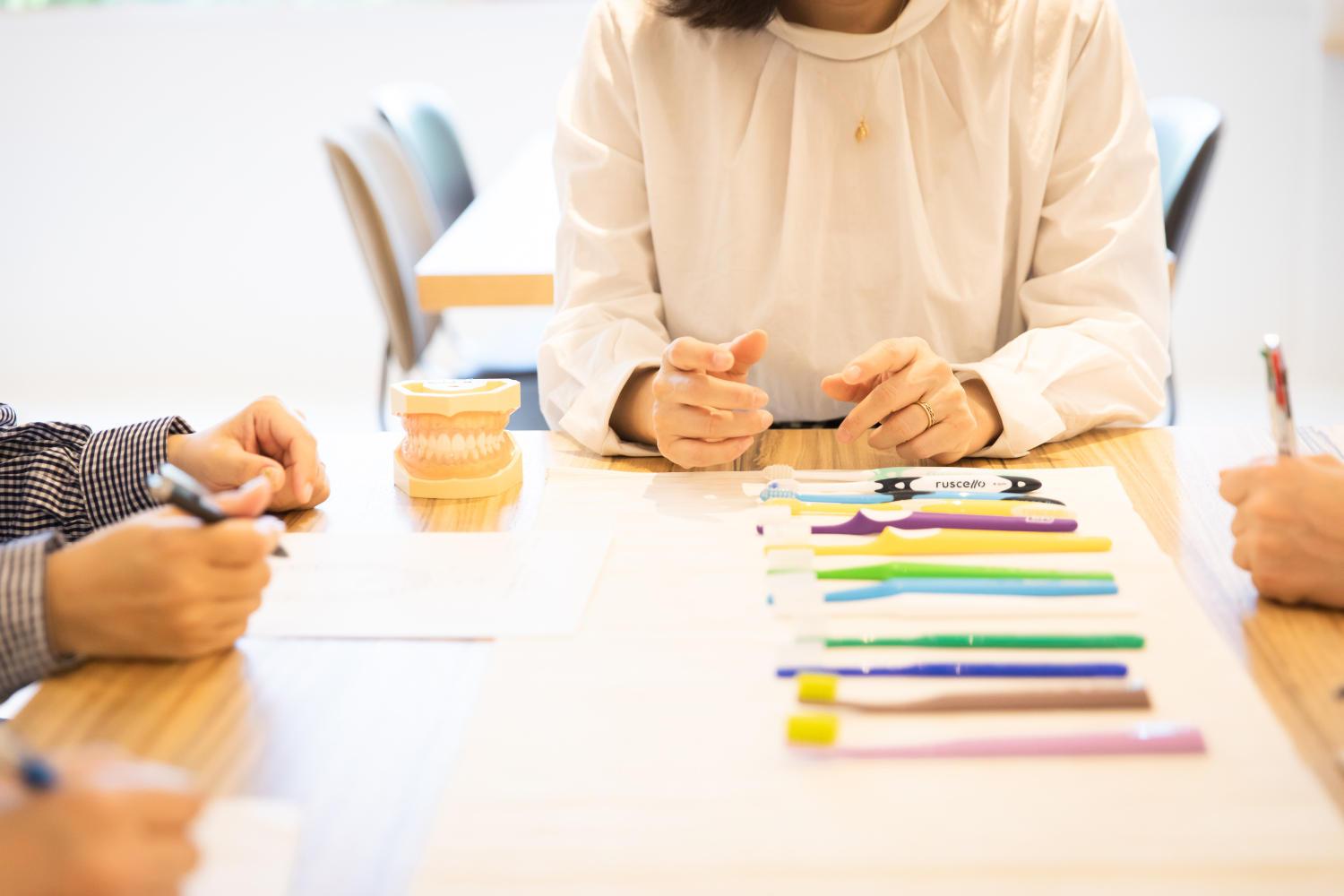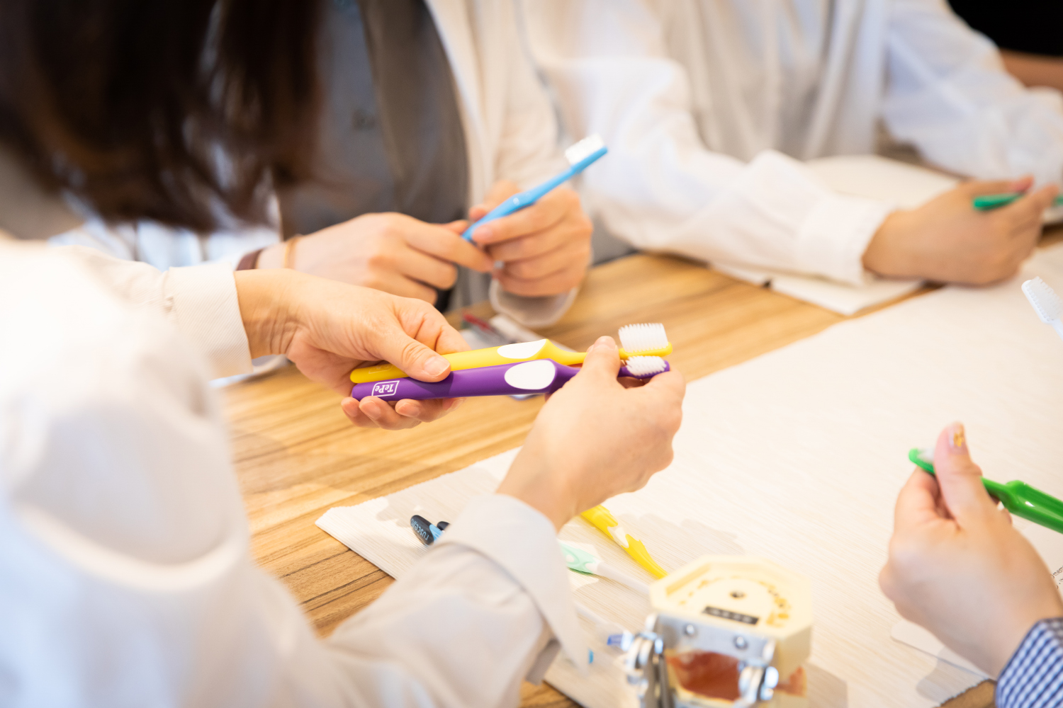 ラプレスタッフがあなたのお口に合わせた歯ブラシを選びます。患者さんの気持ちになることも大切な学びです。